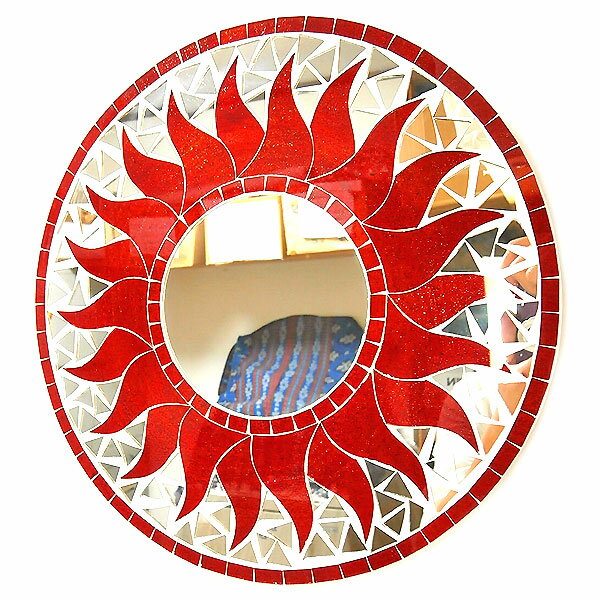 石膏にモザイクでゴールドの太陽を描いた壁掛けミラー、レッドにラメが散りばめられた華やかな色合いです。