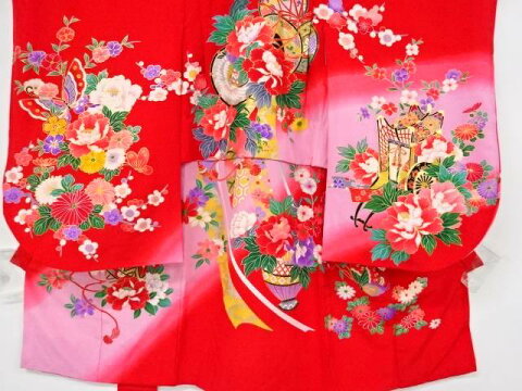 B反 金彩御所人形に草花模様子供着物仮絵羽(八掛付き)【リサイクル】【中古】